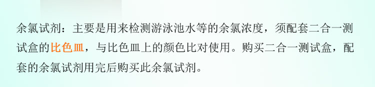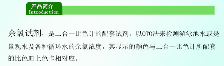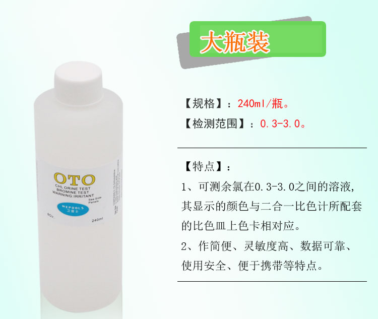 OTO余氯試劑,是二合一比色計(jì)的配套試劑,以O(shè)TO法來(lái)檢測(cè)游泳池水或是景觀水及各種循環(huán)水的余氯濃度,其顯示的顏色與二合一比色計(jì)所配套的比色皿上色卡相對(duì)應(yīng)。
