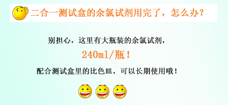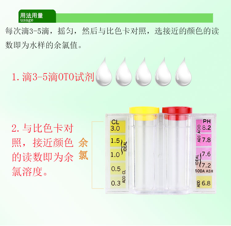 每次滴5滴OTO余氯試劑,搖勻,即可與色卡對(duì)照,選接近的顏色的讀數(shù)即為水樣的余氯濃度。