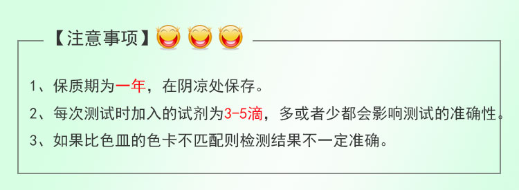 2、每次測(cè)試時(shí)加入的試劑為3-5滴,多或者少都會(huì)影響測(cè)試的結(jié)果。