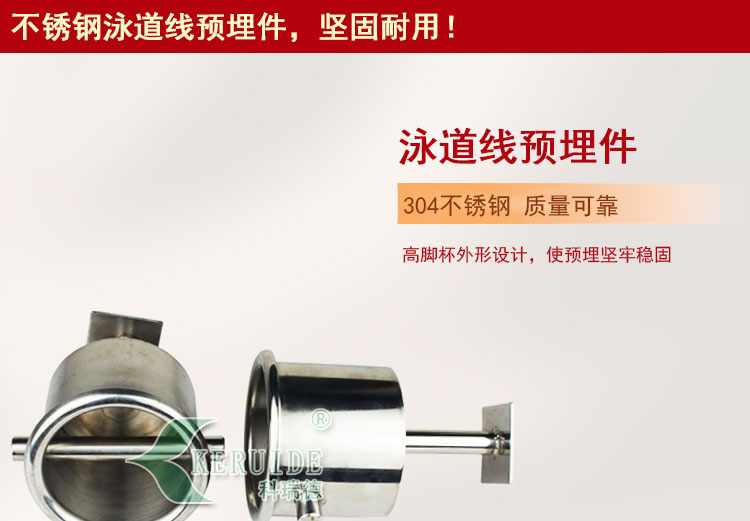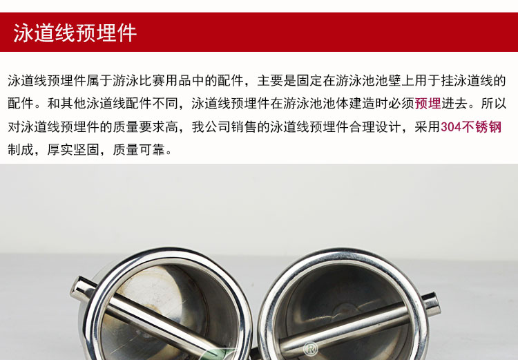 泳道線預(yù)埋件:屬于游泳比賽用品中的泳道配件,固定在游泳池池壁上用于掛泳道線的不銹鋼配件。和其他泳道線配件不同,泳道線預(yù)埋件在游泳池池體建造時(shí)必須預(yù)埋進(jìn)去。所以對(duì)泳道線預(yù)埋件的質(zhì)量要求高,我公司銷售的泳道線預(yù)埋件合理設(shè)計(jì),采用304不銹鋼制成,厚實(shí),質(zhì)量可靠。