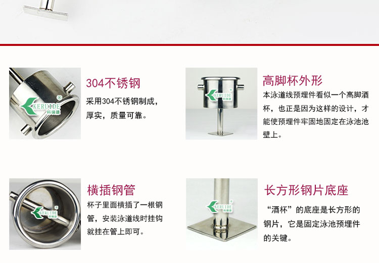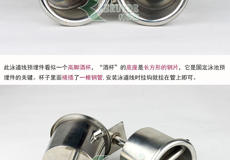 本泳道線預(yù)埋件看似一個(gè)高腳酒杯,也正是因?yàn)檫@樣的設(shè)計(jì),才能使預(yù)埋件在泳池建造之初牢固地固定在泳池池壁上?!熬票钡牡鬃情L(zhǎng)方形的鋼片,它是固定泳池預(yù)埋件的關(guān)鍵。杯子里面橫插了一根鋼管,安裝泳道線時(shí)掛鉤就掛在鋼管上即可。