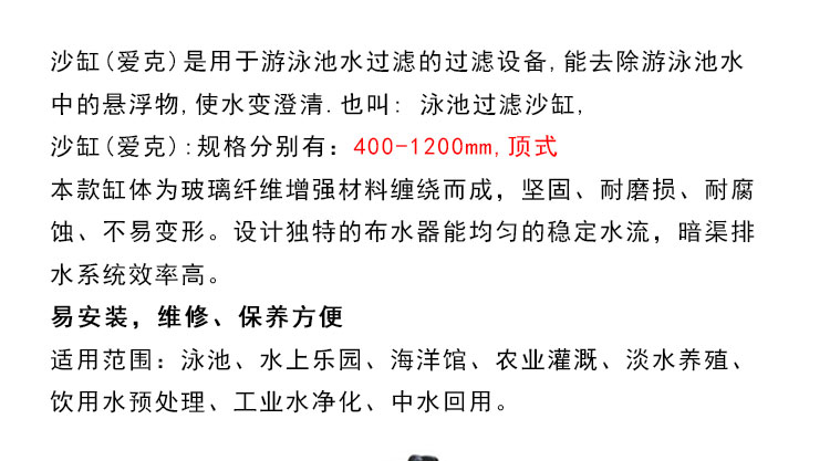 缸(愛克):規(guī)格為400-1200mm,頂式,適用于游泳池水過濾的過濾設(shè)備,能去除游泳池水中的懸浮物,使水變清.也叫:泳池過濾沙缸
