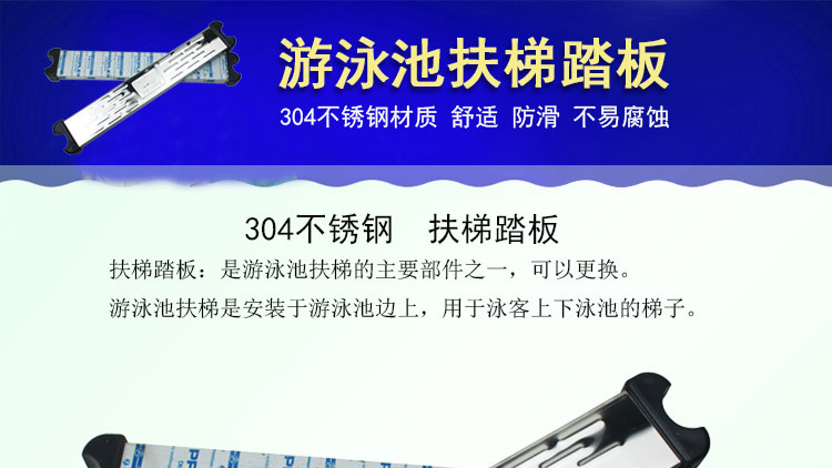 扶梯踏板是游泳池扶梯的主要部件之一,可以更換。游泳池扶梯是安裝于游泳池邊上,用于泳客上下泳池的梯子。