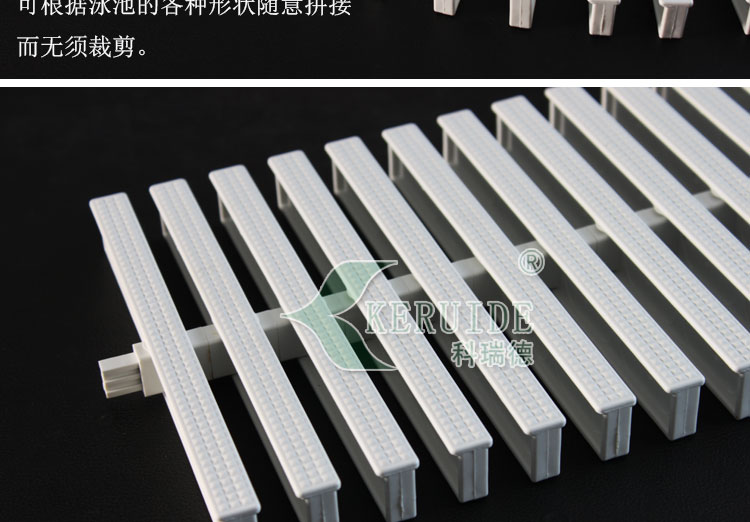 游泳池格柵,又叫泳池游泳池排水溝格柵,防滑渠面格柵,也可叫游泳池溢水格柵、防滑篦子、渠面篦子、地溝蓋;一般人們簡稱為格柵。作用為:作為游泳池四周排水溝的塑料蓋板,在保持可以方便人們的情況下又起到排水的功能。屬于游泳池排水設(shè)備。