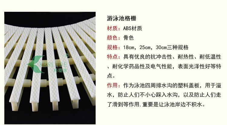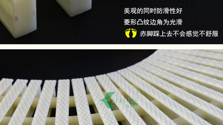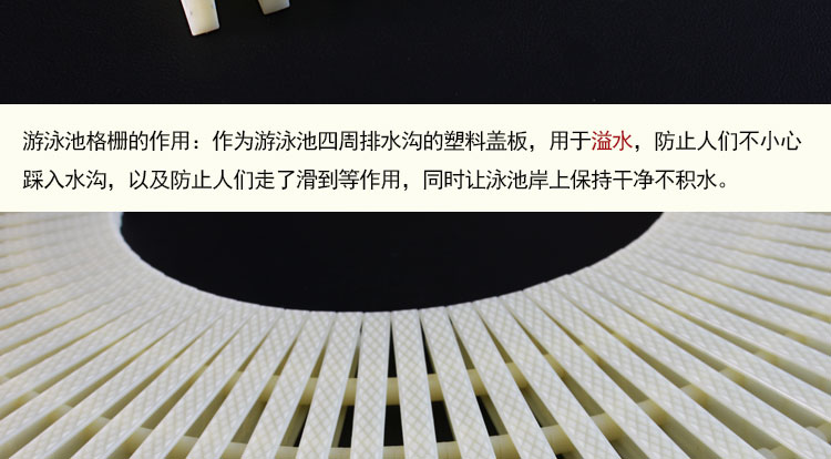 其一:防滑性,本泳池格柵表面布滿菱形的凸紋,具有非常好的防滑效果,凸紋邊緣柔和,清洗方便。