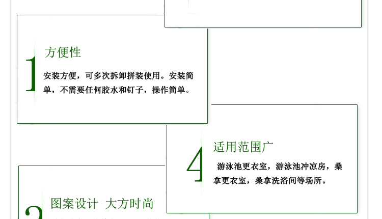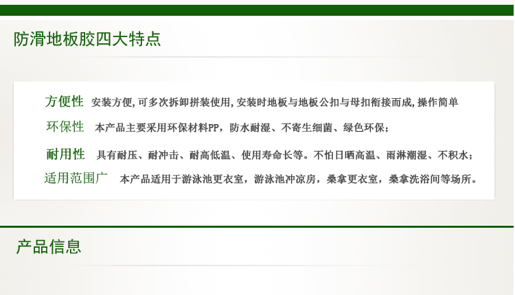 作用:防滑地板膠,防滑墊等泳池產(chǎn)品廠家直銷,省去中間環(huán)節(jié),讓顧客買到性價比高的產(chǎn)品.