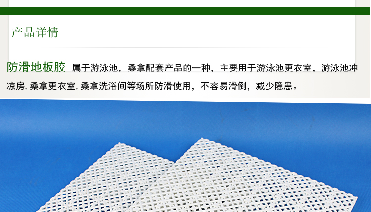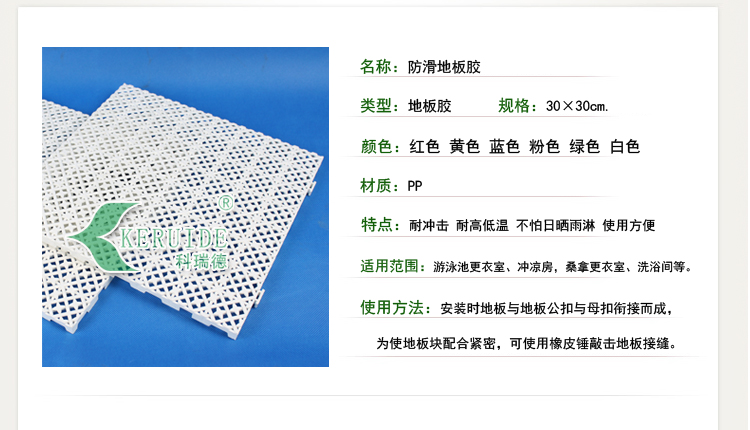 游泳池防滑地板膠是用于游泳池更衣室,浴室等的防滑,拼接式,也叫防滑墊,適用于有游泳池岸邊,浴室,更衣室等需防滑的場合。