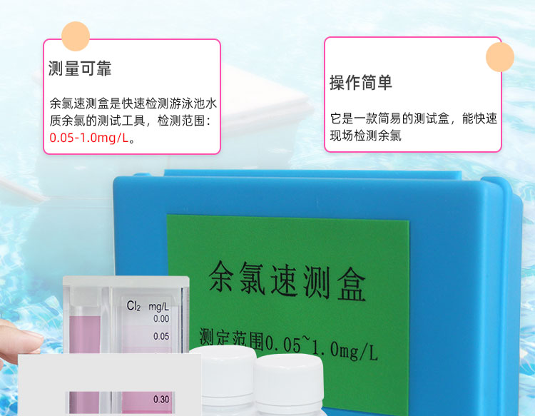 本余氯速測盒用于游泳池水質(zhì)快速檢測的檢測盒,檢測范圍:0.05-1.0mg/L。其操作簡單、測量數(shù)值可靠、快速,是維護游泳池水質(zhì)的工具。