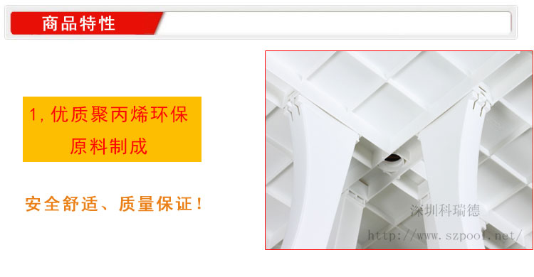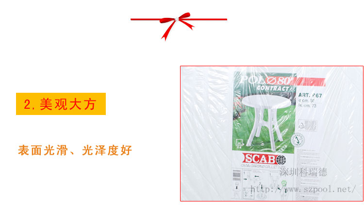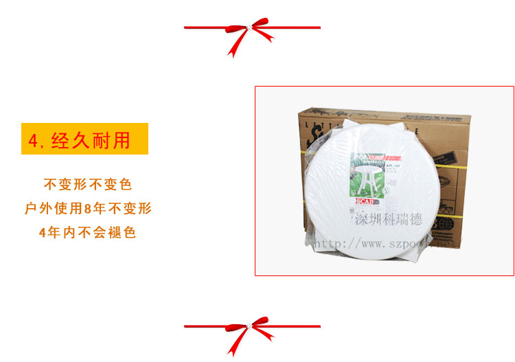 產(chǎn)品優(yōu)質(zhì)聚丙烯環(huán)保原料,防紫外線,4年內(nèi)不會褪色;耐氣候,零下20℃不老化、折疊后存儲運輸都很方便。表面光滑、安全舒適、質(zhì)量可靠、耐老化、價格合理、結(jié)構(gòu)堅固,抗日曬雨淋,戶外使用常年不變形,不褪色。光澤度好,深受顧客好評。