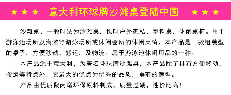 本產(chǎn)品源于意大利,為著名環(huán)球牌沙灘桌,本產(chǎn)品除了具有方便移動,搬運等特點外,它最大的優(yōu)點為優(yōu)秀的品質(zhì),美的造型。