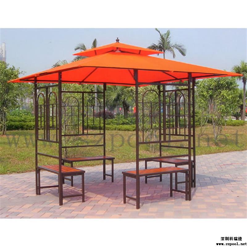 涼亭(JJBH-02):由黑色的鐵架和紅色的頂蓋組成,并附有4個座椅,可供8-10人同時休閑,適合與小區(qū)綠色花園相搭配 。