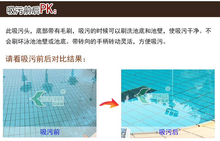 此吸污頭底部帶有毛刷,吸污的時(shí)候可以刷洗池底和池壁,使吸污干凈。毛刷為塑料毛刷,不會(huì)刷壞泳池池壁或池底。帶轉(zhuǎn)向的手柄轉(zhuǎn)動(dòng)靈活,方便吸污。