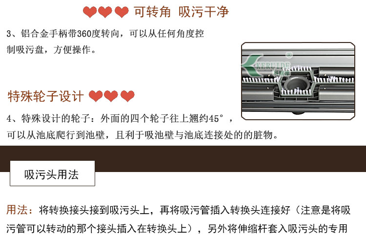 3,鋁合金手柄帶360度轉(zhuǎn)向,可以從任何角度控制吸污盤,方便操作。