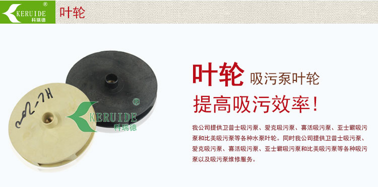 吸污泵葉輪:也叫做水泵葉輪。我公司提供衛(wèi)普士吸污泵、愛克吸污泵、喜活吸污泵、亞士霸吸污泵和比美吸污泵等各種水泵葉輪。同時我公司提供這些吸污泵以及吸污泵維修服務(wù)。