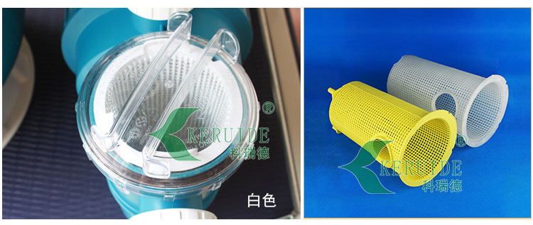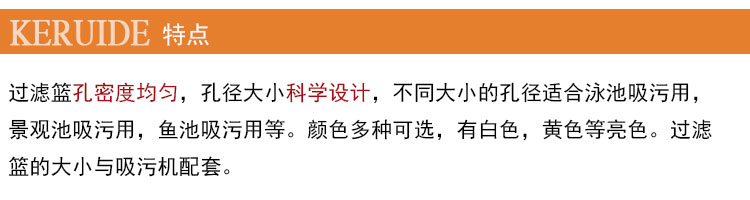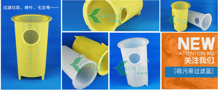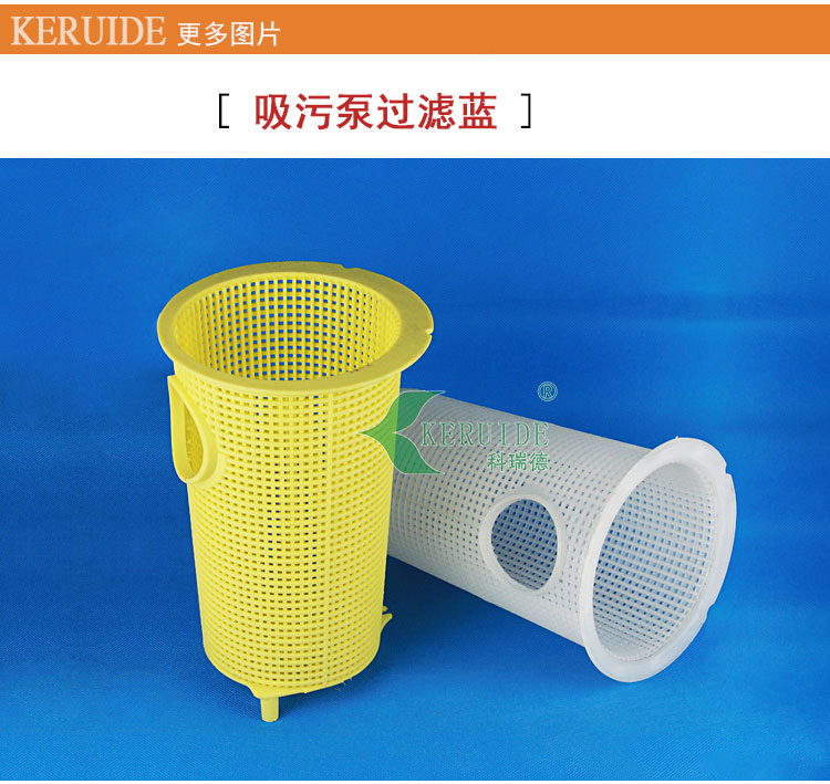 本產(chǎn)品使用過濾籃孔密度均勻,孔徑大小科學(xué)設(shè)計(jì),不同大小的孔徑適合泳池吸污用,景觀池吸污用,魚池吸污用等。顏色多種可選,有白色,黃色等亮色。過濾籃的大小與吸污機(jī)配套。
