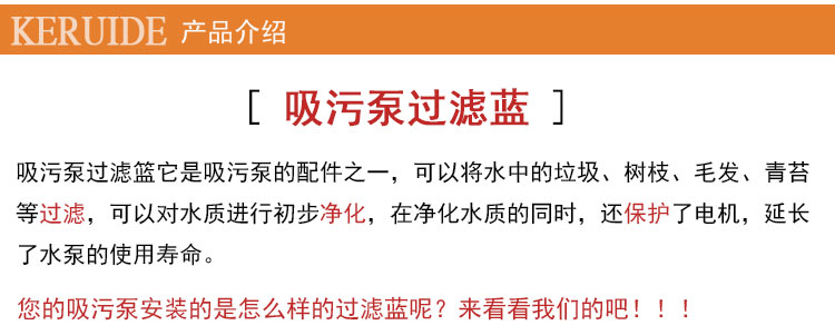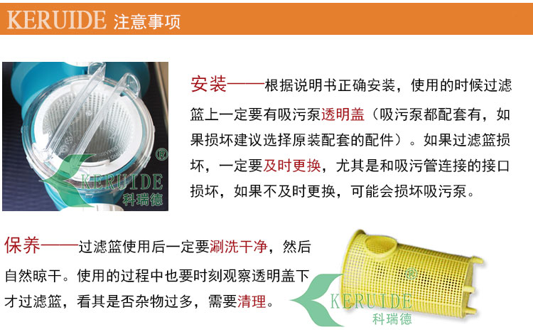 安裝——根據(jù)說明書正確安裝,使用的時(shí)候過濾籃上一定要有吸污泵透明蓋(吸污泵都配套有,如果損壞建議選擇原裝配套的配件)。如果過濾籃損壞,一定要及時(shí)更換,尤其是和吸污管連接的接口損壞,如果不及時(shí)更換,可能會(huì)損壞吸污泵。
