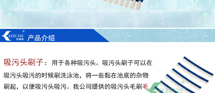 吸污頭刷子:用于各種吸污頭。吸污頭刷子可以在吸污頭吸污的時候刷洗泳池,將一些黏在池底的雜物刷起,以便吸污頭吸污。我公司提供的吸污頭毛刷毛質(zhì)好,整齊不易脫落。