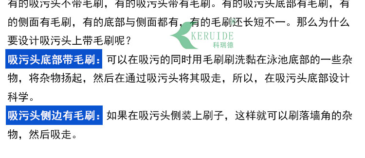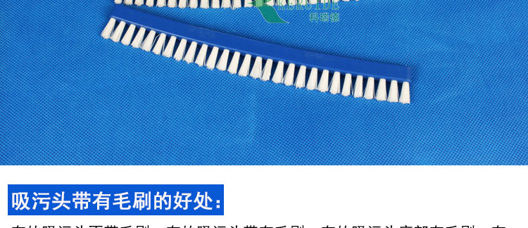 吸污頭帶有毛刷的好處,有的吸污頭不帶毛刷,有的帶有毛刷,那么為什么要設計吸污頭上帶毛刷呢,有的吸污頭的毛刷還是底部與側(cè)面都有,有的毛刷還長短不一。吸污頭帶有毛刷,可以在吸污的同時用毛刷刷洗黏在泳池底部的一些雜物,將雜物揚起,然后在通過吸污頭將其吸走,如果在吸污頭側(cè)裝上刷子,這樣就可以刷落墻角的雜物,然后吸走。