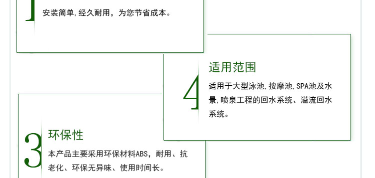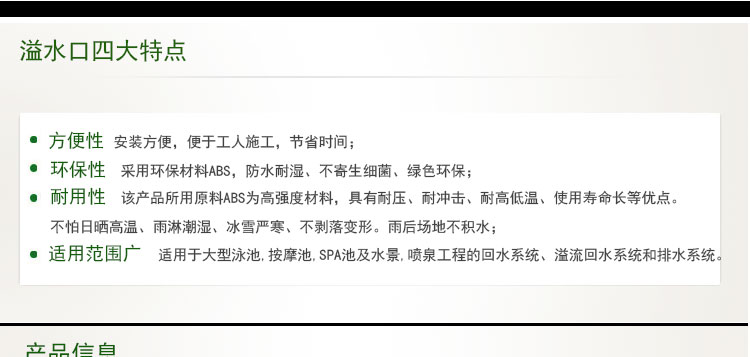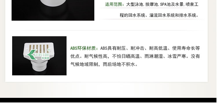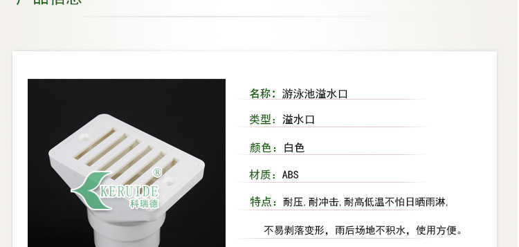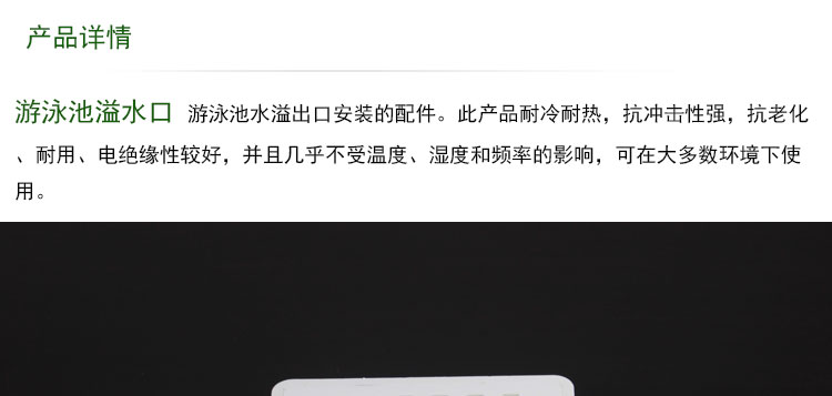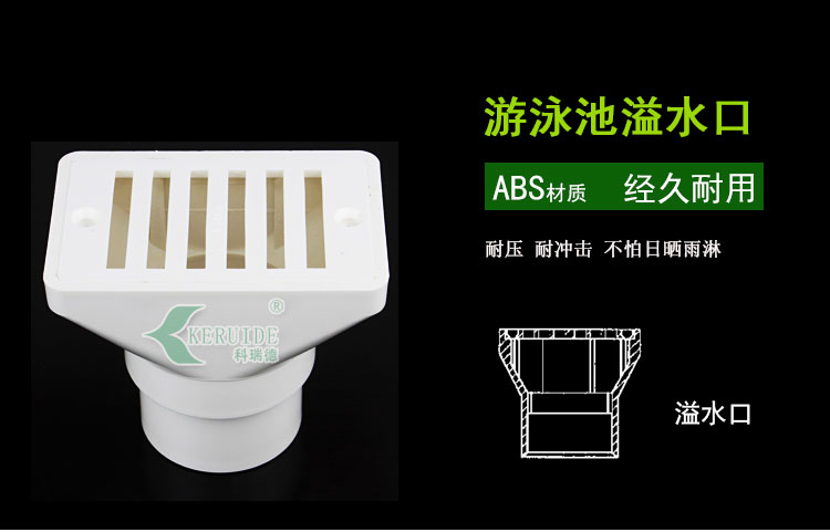 溢水口是游泳池水溢出口安裝的專用塑料件,材質(zhì)為ABS。
