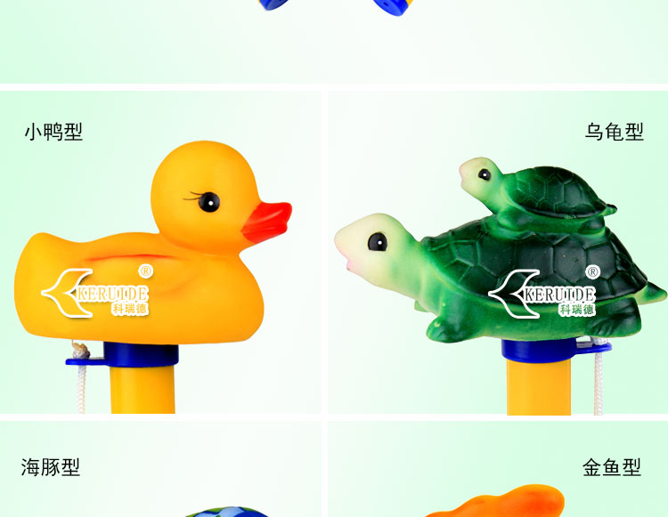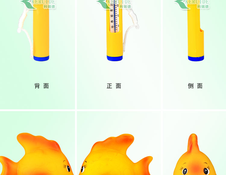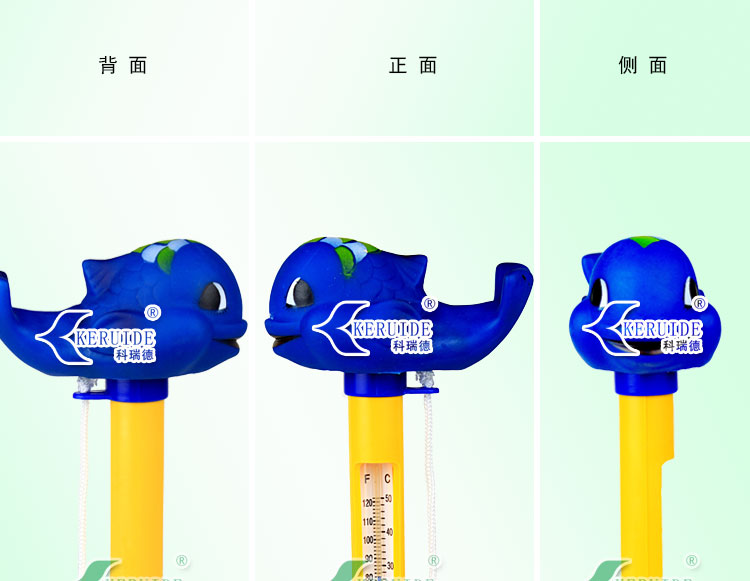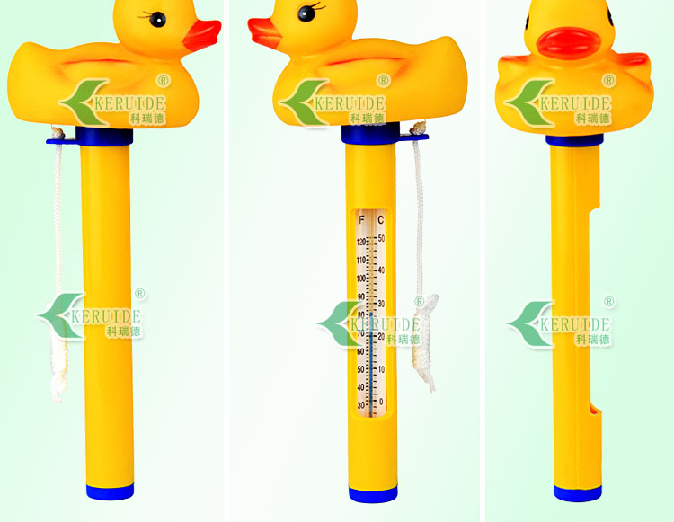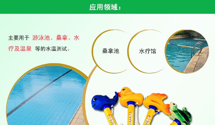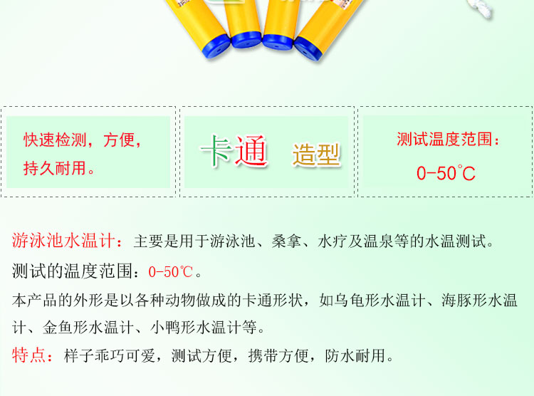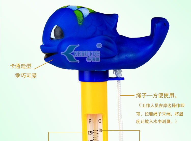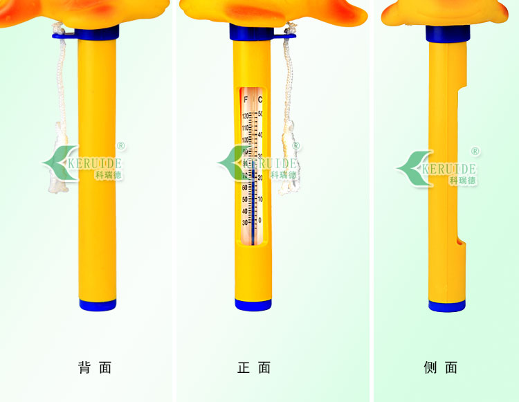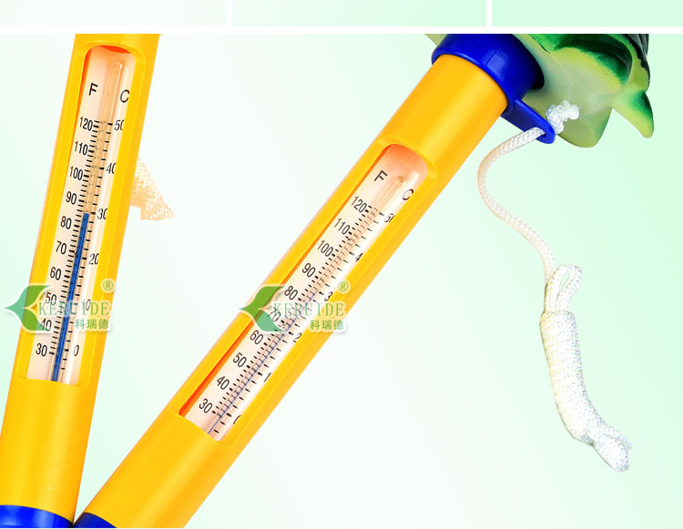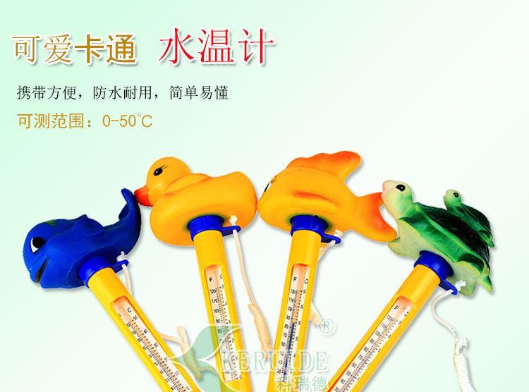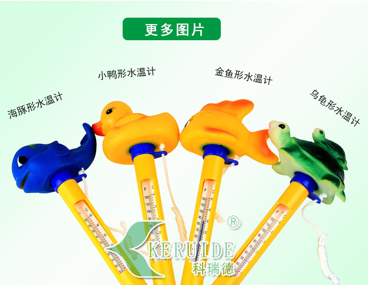 游泳池水溫計(jì),溫度計(jì)的一種,主要是用于游泳池、桑拿、水療及溫泉等的水溫測(cè)試,測(cè)試的溫度范圍是:0-50℃。本產(chǎn)品的外形是以各種動(dòng)物做成的卡通形狀,如烏龜形水溫計(jì)、海豚形水溫計(jì)、金魚形水溫計(jì)、小鴨形水溫計(jì)等,樣子乖巧可愛,測(cè)試方便、耐用。
