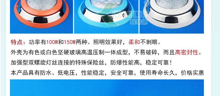 外殼為有色或白色堅硬玻璃高溫壓制一體成型,不易破碎,而且高密封性,美觀。加強型雙螺旋燈絲連接的特殊保險絲,防爆性能高,可靠。本產(chǎn)品具有防水、低電壓,性能穩(wěn)定,可靠,使用壽命長,價格實惠等特點,廣泛用于水下安裝使用。更多咨詢客服。