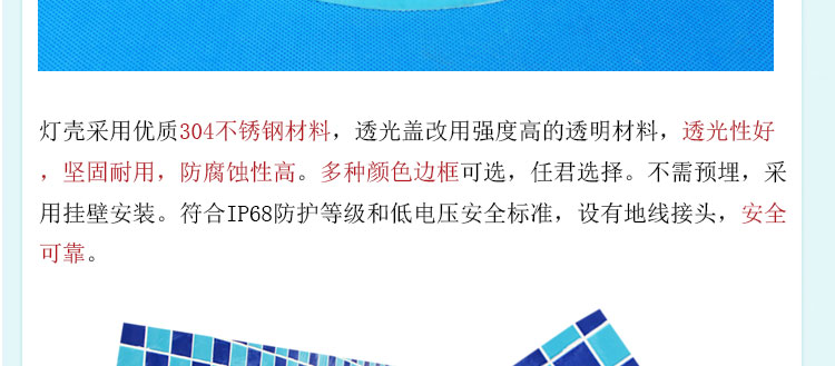 燈殼采用優(yōu)質(zhì)304不銹鋼材料,透光蓋改用強度極高的透明材料,透光性好,堅固耐用,防腐蝕性極高。防水設(shè)計。多種顏色邊框可選,是您泳池燈理想的選擇。