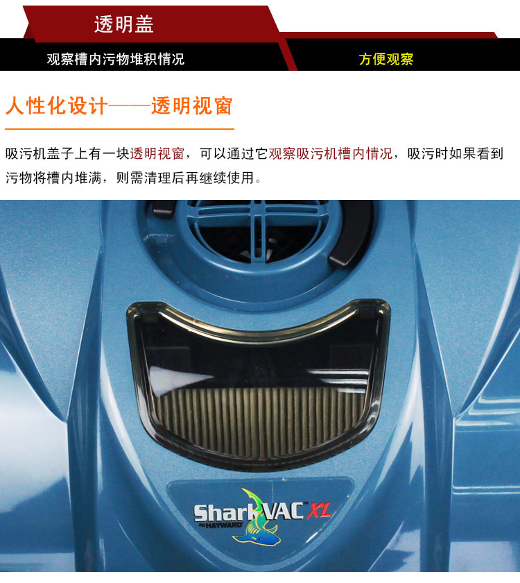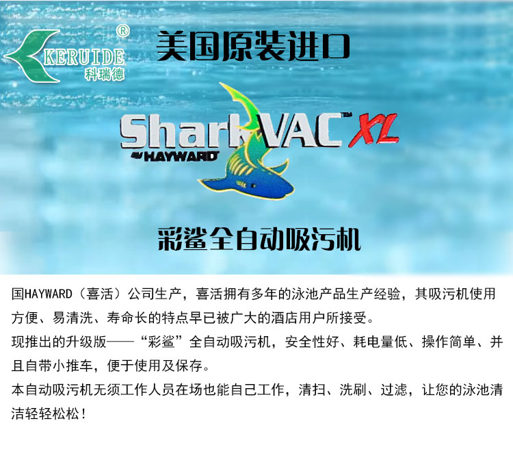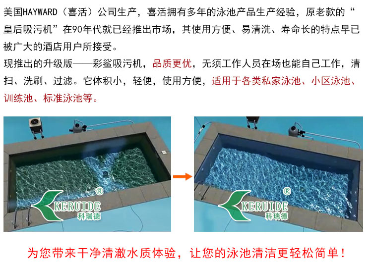 【品牌介紹】:彩鯊游泳池吸污機(jī)由美國(guó)HAYWARD亨沃(喜活)公司生產(chǎn),是皇后吸污機(jī)的升級(jí)版。喜活擁有多年的泳池產(chǎn)品生產(chǎn)經(jīng)驗(yàn),擁有先進(jìn)的全自動(dòng)吸污機(jī)技術(shù),使用方便、易清洗、壽命長(zhǎng)。