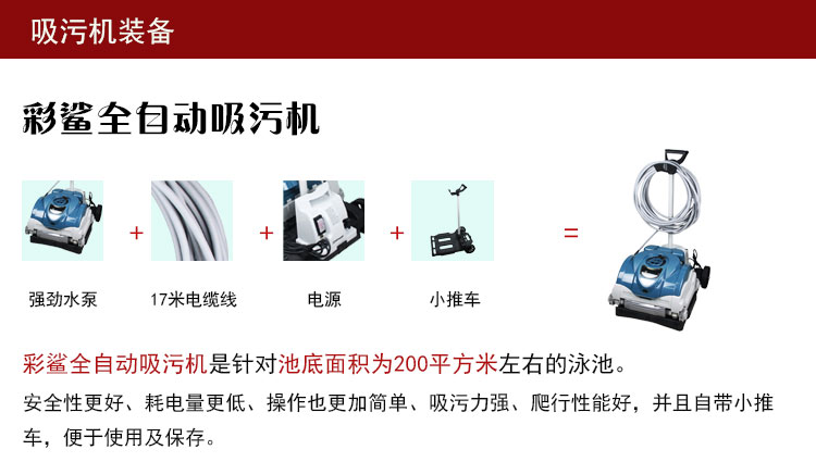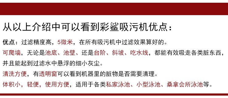 【適用范圍】彩鯊吸污機(jī)體積小,輕便,使用方便,適用于各類(lèi)私家泳池、別墅泳池,小型泳池、桑拿會(huì)所泳池等。另外,彩鯊吸污機(jī)保修期為1年,客戶可放心購(gòu)買(mǎi)和使用。
