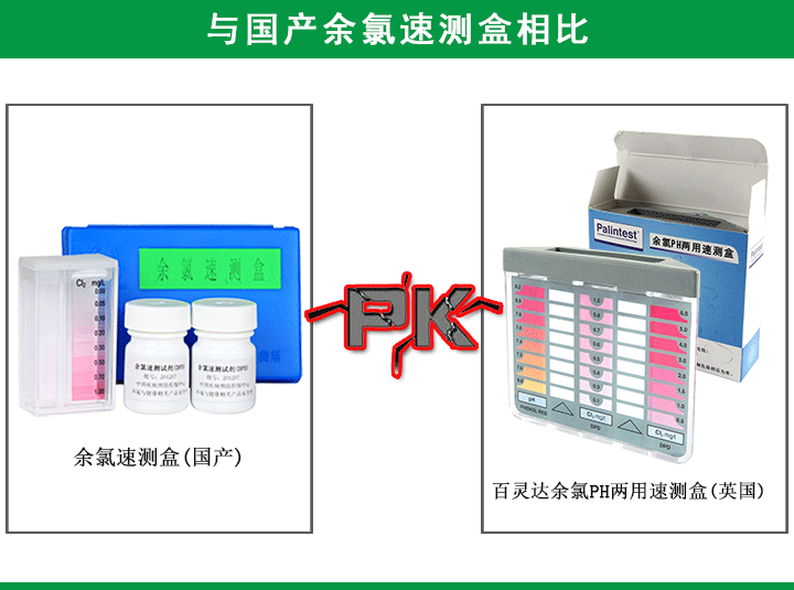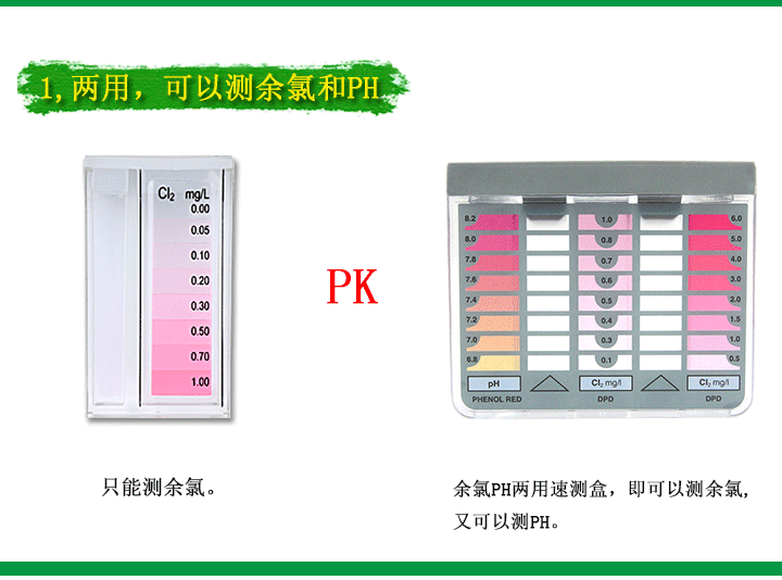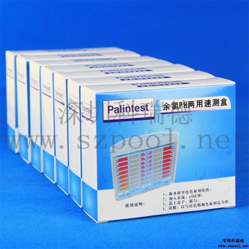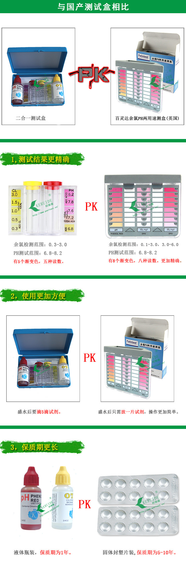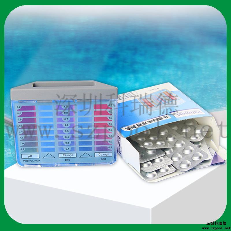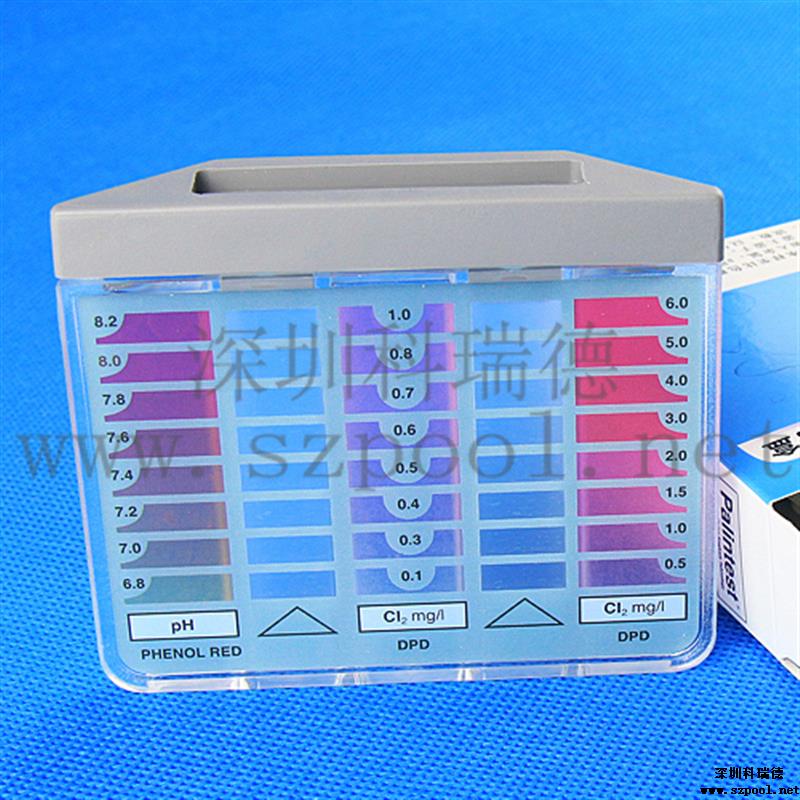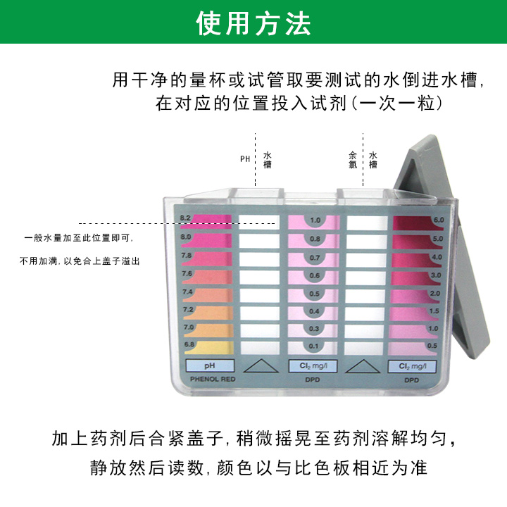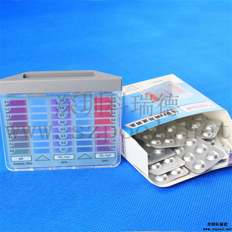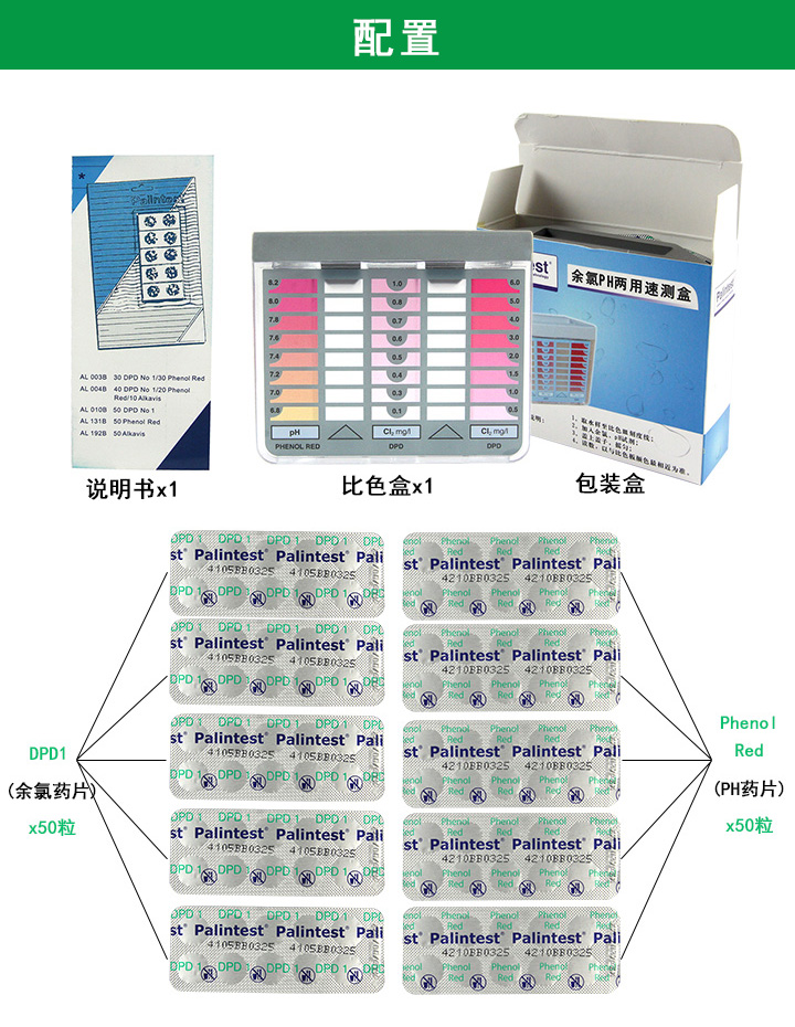 【配置】:主要包括包裝盒,比色盒,50粒PH試劑,50粒余氯試劑和說明書。(注:此配套試劑用于此測試盒檢測,不適用于光度計檢測)