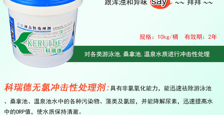 科瑞德無氯沖擊性處理劑具有非氯氧化能力,能迅速祛除游泳池、桑拿池、水療池中的各種污染物、藻類及氯胺,并能降解尿素,迅速提高水中的ORP值,使水質(zhì)保持清澈。