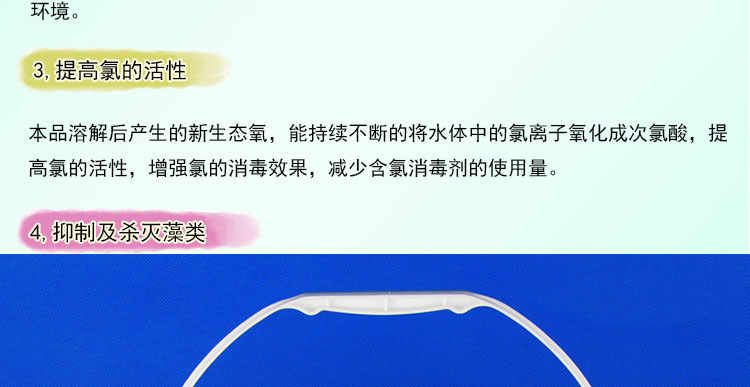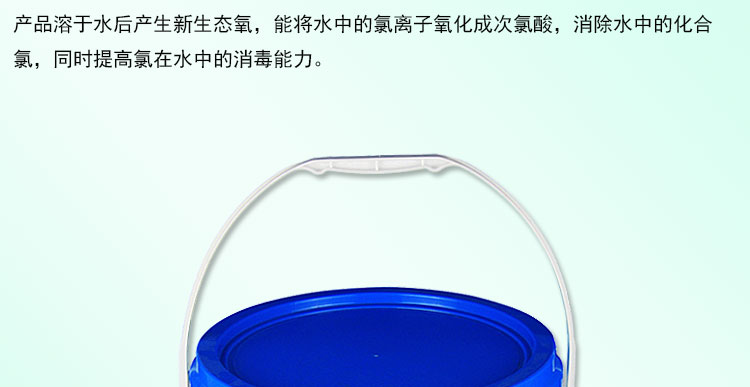 無氯沖擊性處理劑溶于水后產(chǎn)生新生態(tài)氧,能將水中的氯離子氧化成次氯酸,消除水中的化合氯,同時提高氯在水中的消毒能力。