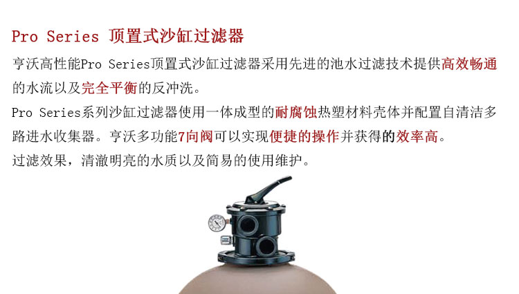 亨沃高性能Pro Series頂置式沙缸過濾器采用先進(jìn)的池水過濾技術(shù)提供,暢通的水流以及完全平衡的反沖洗過濾設(shè)備。