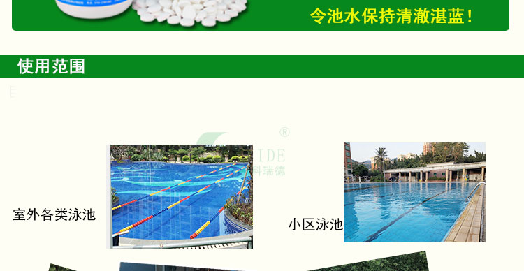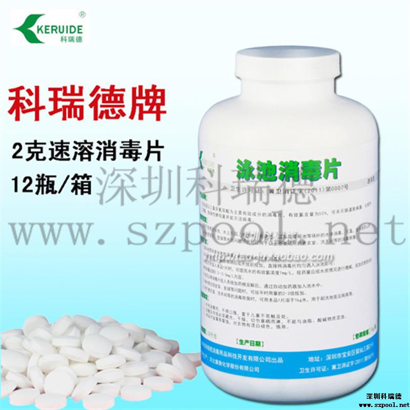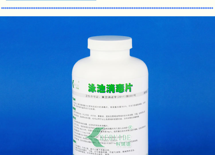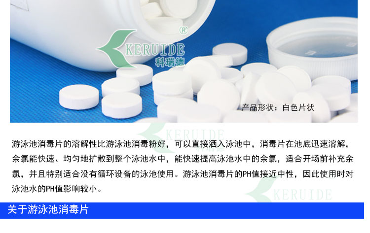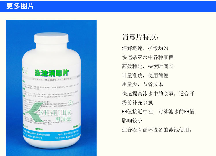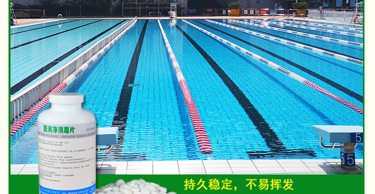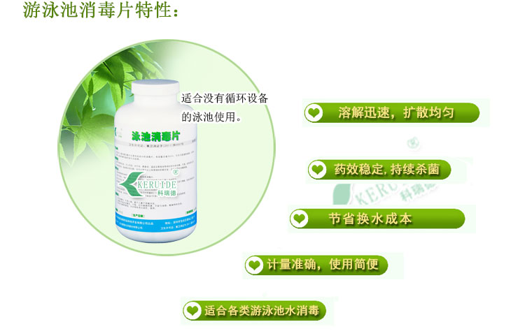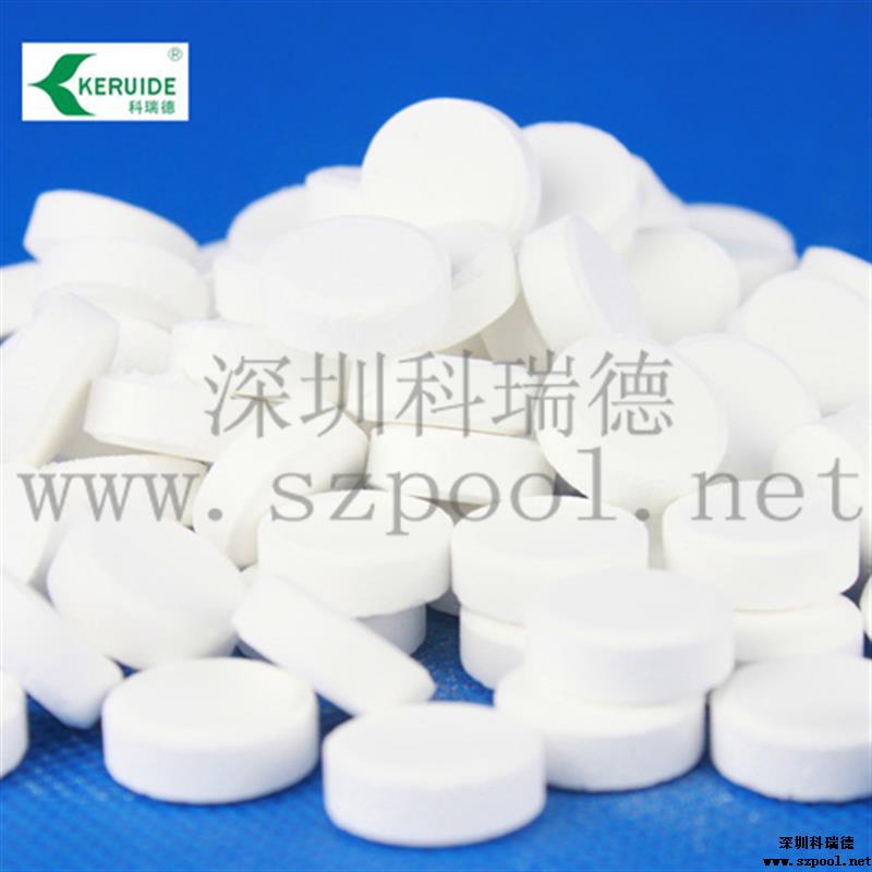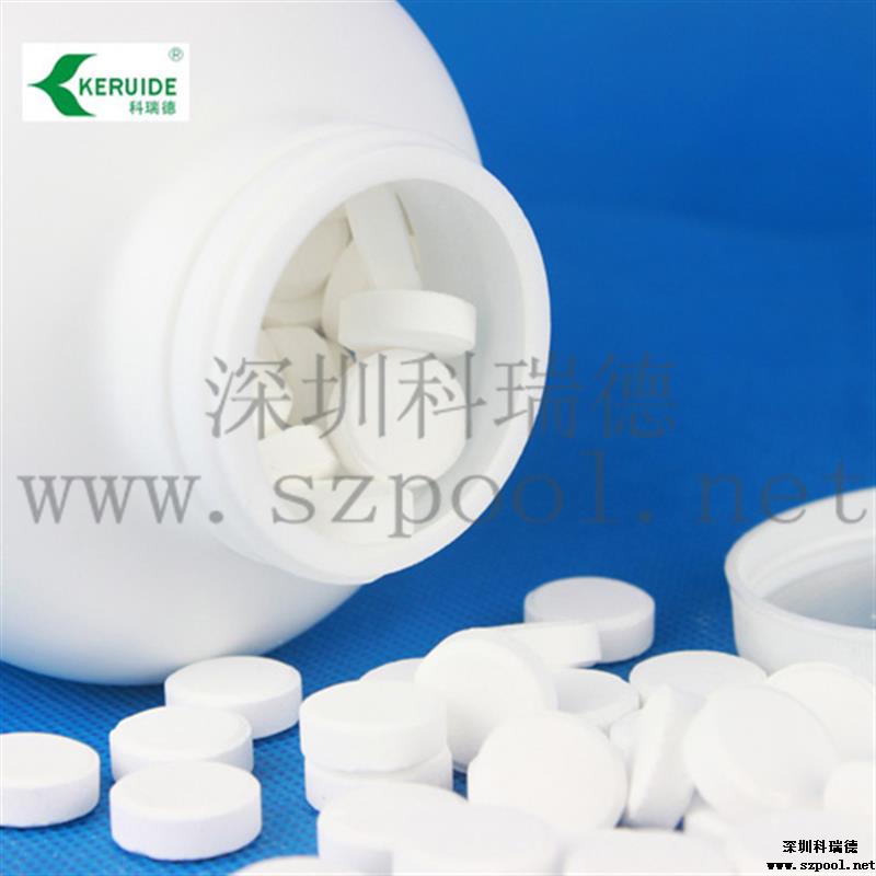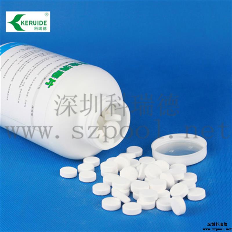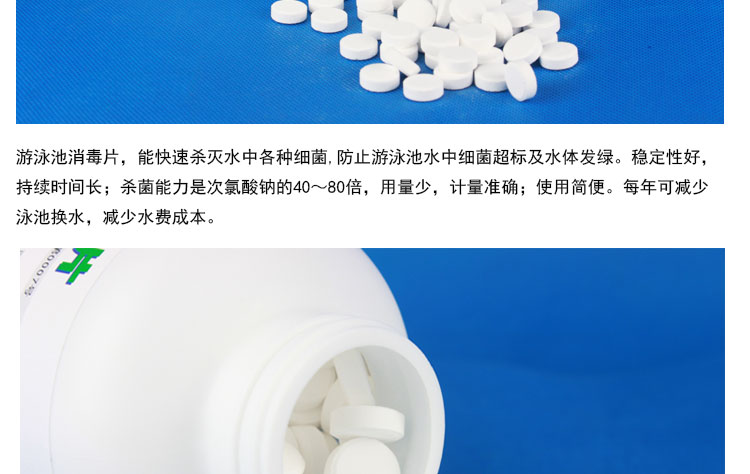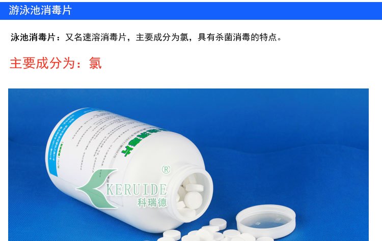 游泳池消毒片的溶解性比游泳池消毒粉好,可以直接灑入泳池中,泳池消毒片在池底迅速溶解,氯能快速、均勻地擴散到整個泳池水中,能快速提高泳池水中的余氯,適合開場前補充余氯,并且特別適合沒有循環(huán)設備的泳池使用。游泳池消毒片的PH值接近中性,因此使用時對泳池水的PH值影響較小。
