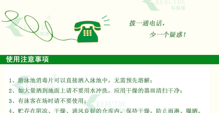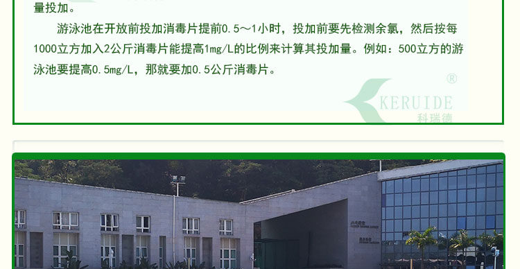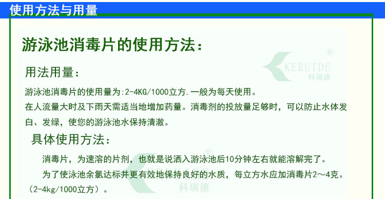 【用法用量】:用于游泳池水消毒時,每天用量約為每1000立方投放2-4公斤,泳客較多或下雨天氣時要適當?shù)卦黾铀幜?。游泳池消毒藥劑的投放量足夠時,可以防止水體發(fā)白、發(fā)綠,使你的游泳池水保持清澈湛藍。
