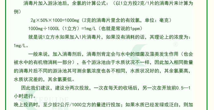 1、游泳池泡騰消毒片可以直接灑入泳池中,無需預先溶解;