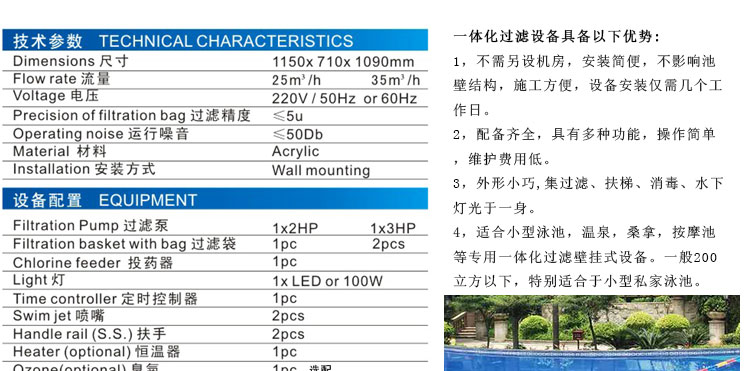 4.適合小型泳池,溫泉,桑拿,按摩池等專用一體化過濾壁掛式設(shè)備。一般200立方以下,特別適合于小型私家泳池。