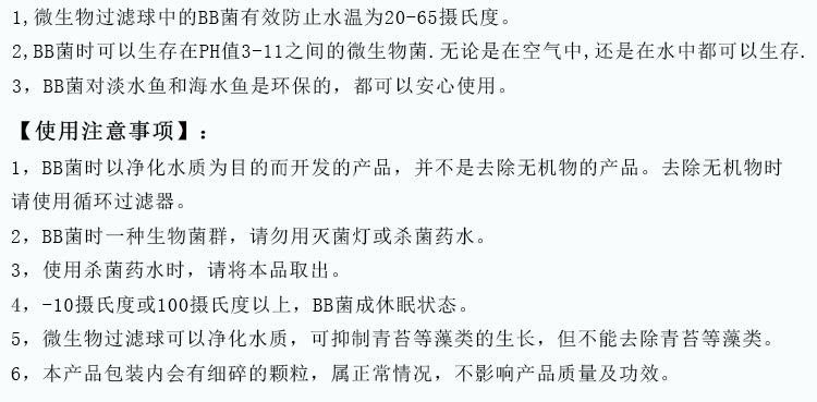 3)本產(chǎn)品為微生物過濾球,從投入到形成良好穩(wěn)定的水質(zhì),根據(jù)魚的數(shù)量和養(yǎng)魚的環(huán)境,需要2-3周的適應(yīng)期。