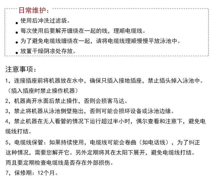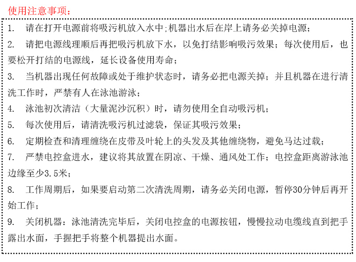 使用方法:使用方法簡單,取出全自動吸污機,理順電纜線,慢慢平放到泳池中,插上電源,打開開關,設定工作時間,它便會自己清理泳池。其內置的微型電腦將自動感應并計算出您泳池的大小,然后通過遙控選擇清潔的時間如2小時,3小時等。在清潔周期結束后清理過濾袋內的臟物。初次使用時請按設定的6個小時的時間讓其運行完一個完整的周期,讓其能記憶泳池的大小。