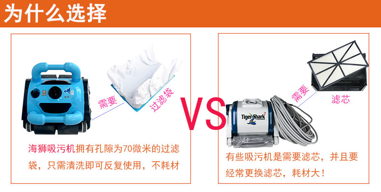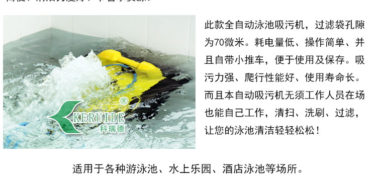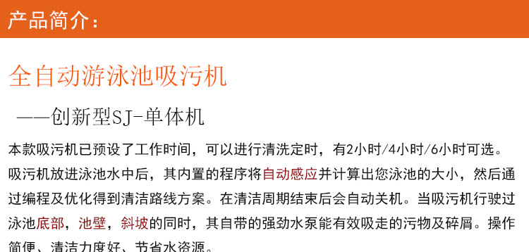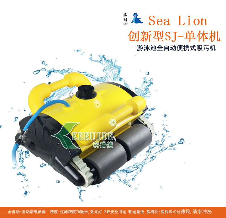 本款吸污機為全自動游泳池吸污機,主要是針對池底面積為100-600平方米左右的泳池。其創(chuàng)新實用,智能。其型號為創(chuàng)新型SJ-單體機,也叫海獅自動泳池吸污機。本款吸污機24V安全電壓、耗電量低、操作也簡單、吸污力強、爬行性能好,并且自帶小推車,便于使用及保存。