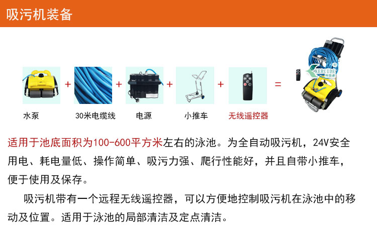另外,本吸污機帶有一個遠程無線遙控器,可以方便地控制吸污機在泳池中的移動及位置。適用于泳池的局部清潔及定點清潔??蛇x擇使用,也可以不使用。