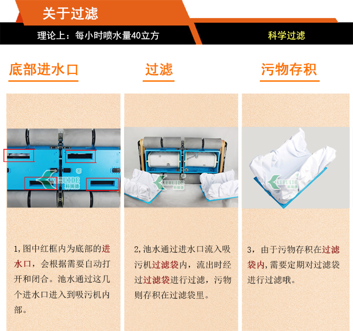 全面清洗:既能清洗池底污物,又能清洗池壁污物,還能對(duì)泳池水進(jìn)行過(guò)濾。