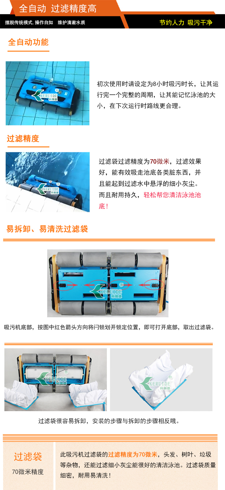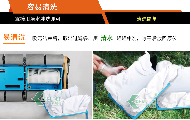 吸污干凈:可爬墻,爬行性好,能清洗泳池四周的池壁及水線(與空氣接觸的部分)。