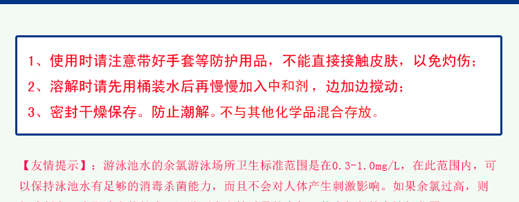 2、按每立方水1克的用量,可以降低1mg/L的氯含量。