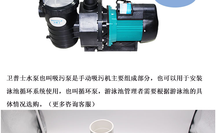 吸污泵是游泳池吸污機(jī)的主要部件(吸污機(jī)還有伸縮竿、吸污頭、小推車、電線等配件),也是過濾系統(tǒng)組成的重要部件,循環(huán)泵。