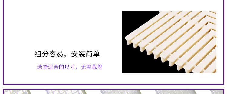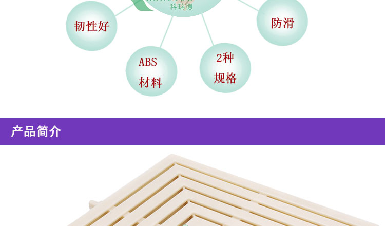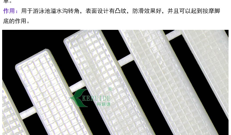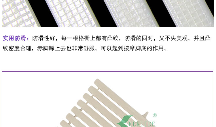 【格柵轉(zhuǎn)角特點(diǎn)】具有防曬,防滑,韌性高不易折斷,抗腐蝕等功能,組分容易,安裝簡(jiǎn)單,使用安全,表面有凸紋具有防滑,腳底按摩功能!