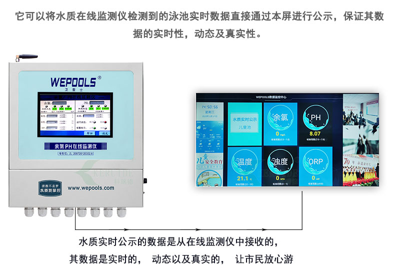 衛(wèi)普士水質(zhì)實時公示屏的設(shè)計理念是為解決目前泳池手寫水質(zhì)數(shù)據(jù)公示的落后方式而研發(fā)的。其水質(zhì)數(shù)據(jù)是通過在線監(jiān)測儀監(jiān)測到的水質(zhì)情況傳送過來公示的,數(shù)據(jù)是實時、動態(tài)以及真實的。并且衛(wèi)普士實時公示屏還可以分屏設(shè)置,給公眾展示游泳場館的各類設(shè)施及宣傳,達到一屏多用的效果。
