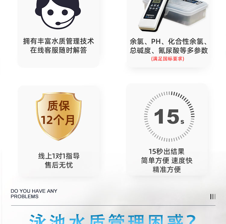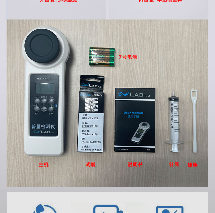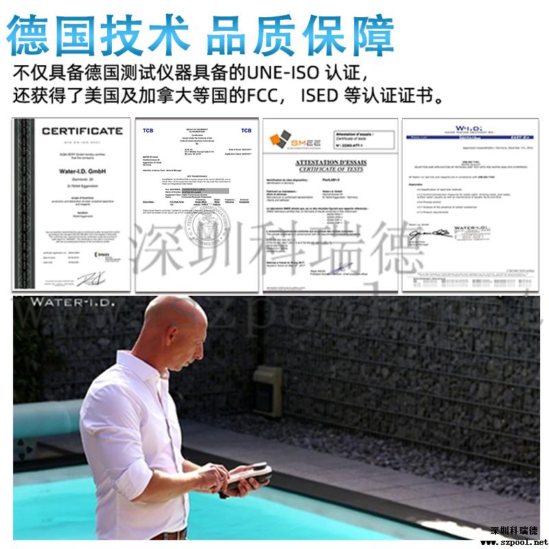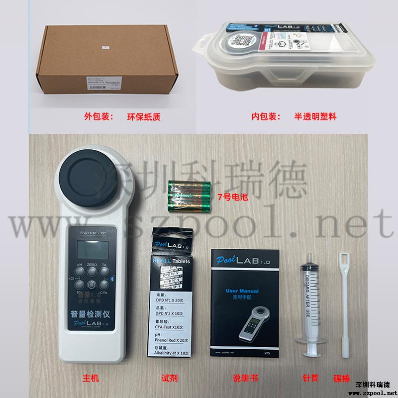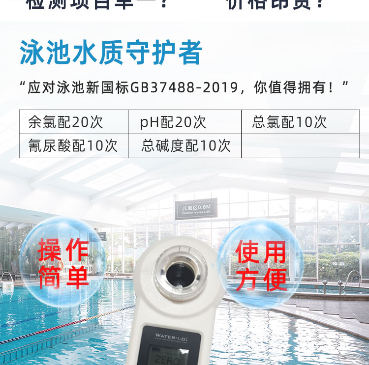 PoolLAB/普量水質(zhì)檢測儀是用于各類游泳池水質(zhì)檢測使用的儀器,它能檢測池水中:余氯/pH/氰尿酸/總堿度/結(jié)合性余氯/鈣硬度等13個(gè)項(xiàng)目指標(biāo),能快速檢測,得出結(jié)果,使用簡單、易懂、性能可靠等特點(diǎn),本款游泳池水質(zhì)檢測儀擁有IP68防水級(jí)別,在使用的過程不慎掉入水中或涉水不用擔(dān)心進(jìn)水,使用壽命長且經(jīng)濟(jì)實(shí)惠,應(yīng)對(duì)國標(biāo)GB37488-2019水質(zhì)項(xiàng)目檢測,每個(gè)游泳場所適合選擇。