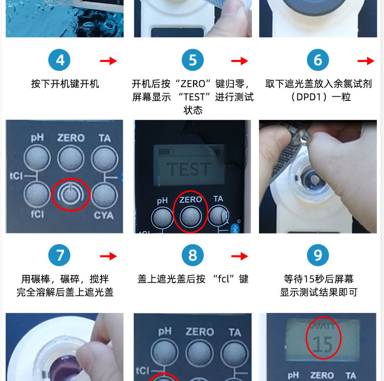 4. 如需測池水中的:余氯/氰尿酸,可以先加入余氯試劑,用碾棒碾碎溶解均勻,無殘留,蓋上遮光罩,按“fcl”鍵,等待15s,顯示測試結(jié)果后,清洗取樣槽,再次取水樣,加入氰尿酸試劑,碾碎溶解均勻,按“CYA”鍵,等待15s,顯示測試結(jié)果。(如果還想連續(xù)測試其它的指標(biāo),清洗取樣槽,重新取水樣,加入想測的試劑即可檢測了)以此類推!