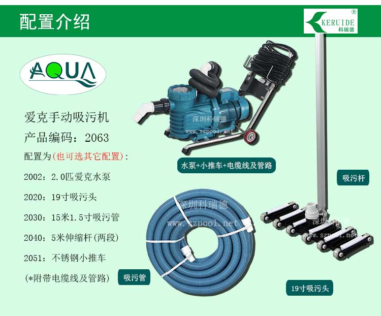 本產(chǎn)品為游泳池手動吸污機(jī)——愛克手動吸污機(jī),由2.0匹愛克吸污泵,以及防腐防曬防變形的雙層自浮吸污軟管和19寸強(qiáng)力吸污頭、5米伸縮桿所組成,適應(yīng)力強(qiáng),適合各種形狀、大小類型的公共泳池、家庭別墅泳池、酒店賓館泳池、健身泳池、洗浴中心水療池、溫泉水池等!