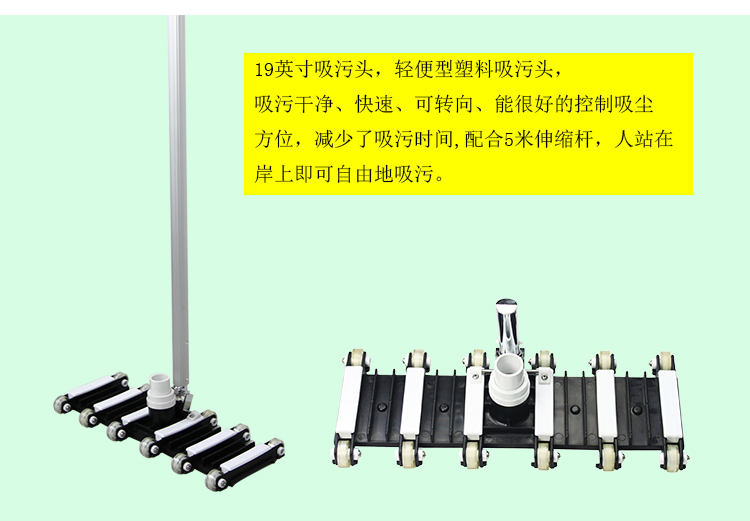 19英寸吸污頭,輕便型塑料吸污頭有多種規(guī)格,吸污快、耐磨、可轉(zhuǎn)向有目的進(jìn)行清潔,減少了吸污時間,配合5米伸縮桿,人站在岸上即可自由地吸污,清潔泳池。